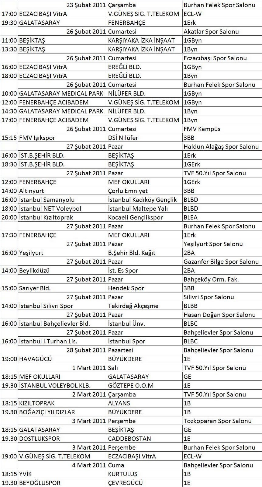 23 ŞUBAT 2011 - 04 MART 2011 MÜSABAKA PROGRAMI